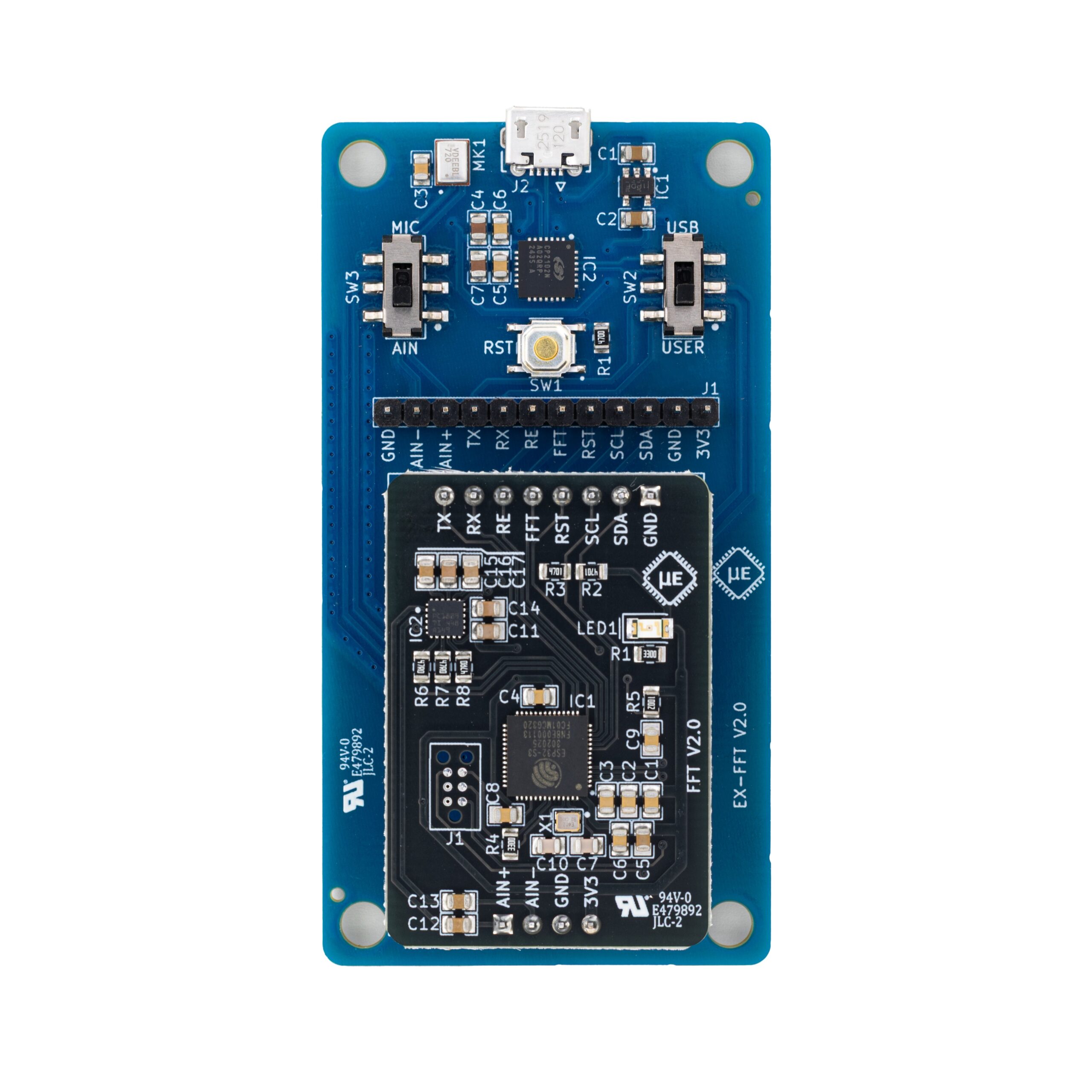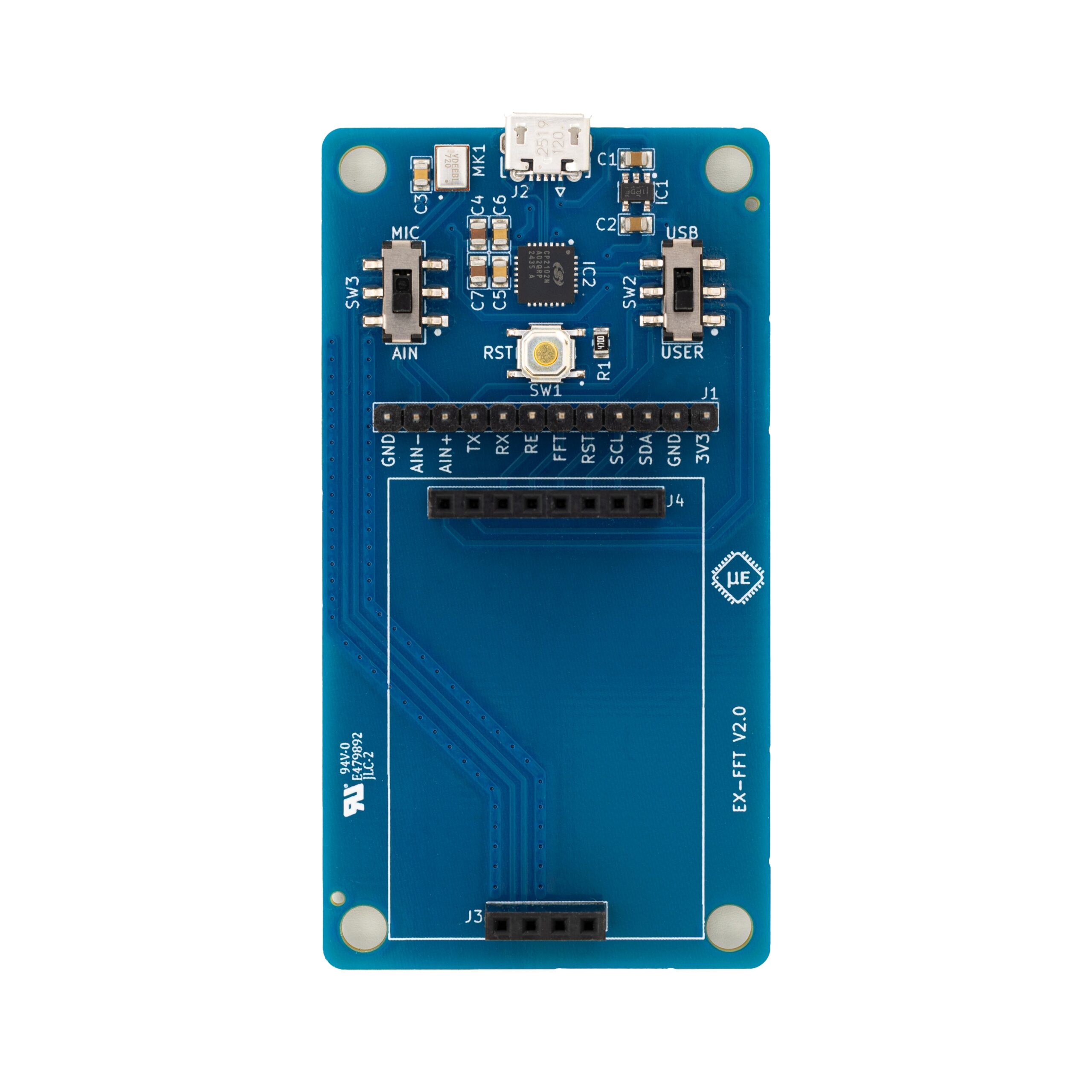 The FFT Extension board provides a comprehensive platform for evaluating the FFT Module. It provides access to serial interface, power, and analog input pins, while a built-in analog microphone enables immediate audio FFT analysis. Additionally, users can easily connect the module to the provided PC application via USB.